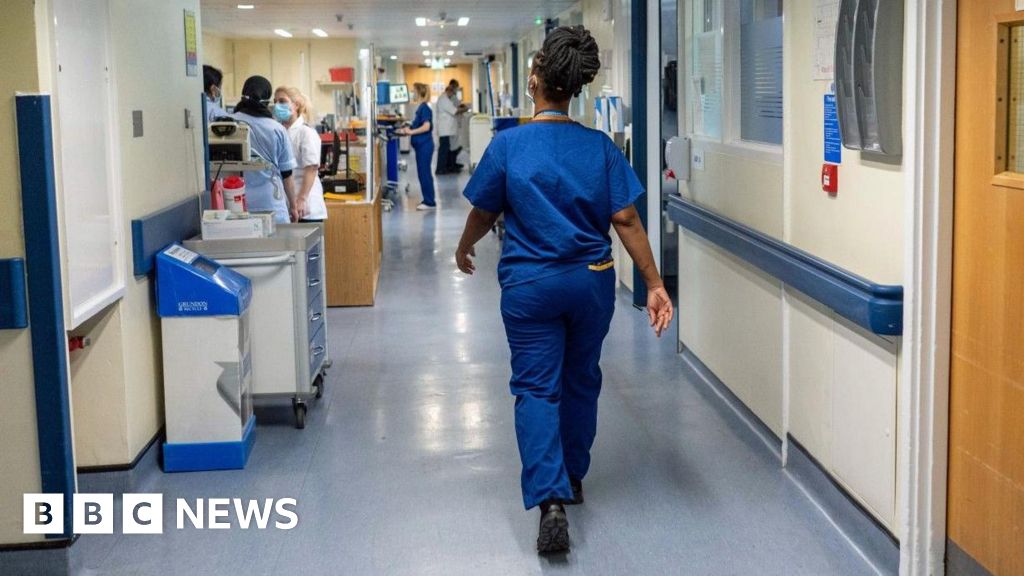 PA Media A nurse in blue scrubs is walking along a hospital corridor with her back to the camera. There are doors along the corridor and there is a hub beyond the nurse where other nurses are talking to each other. PA Media