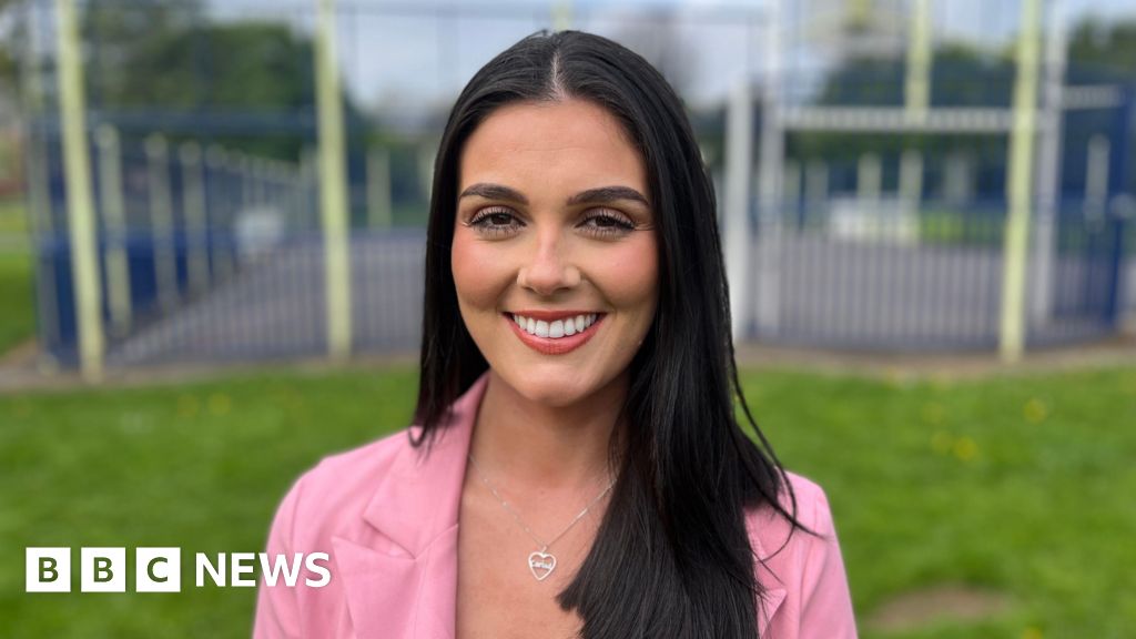BBC A woman with long dark hair, wearing a pink jacket and a silver heart necklace, standing in a park with a basketball court in the backgroundBBC