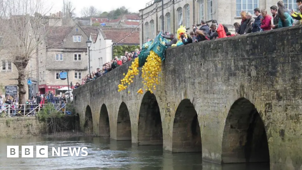 Bradford-on-Avon Town Council Crowds of people stand on an old bridge in Bradford-on-Avon as bags of rubber ducks are thrown into the water. Near the bridge, people stand and watch.Bradford-on-Avon Town Council