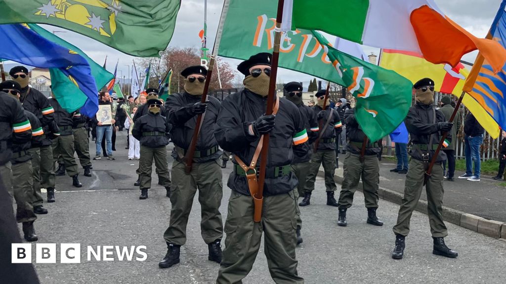 BBCSeveral hundred people, including some in combat uniforms and wearing face coverings, have taken part in a dissident republican Easter commemoration in Londonderry.