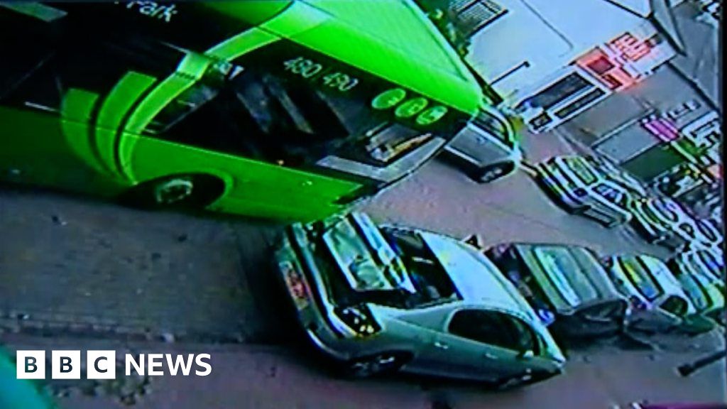 CCTV from a newsagent captures the moment a bus collided with 24 other vehicles in Dartford.