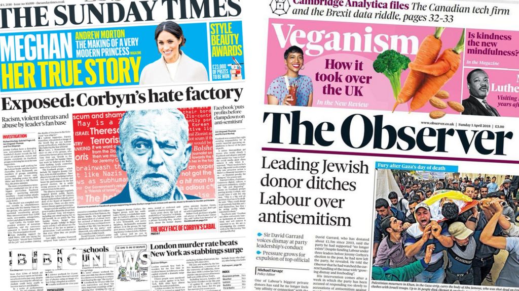 Most of the papers are united in criticising Mr Corbyn's response to the anti-Semitism row within the party. In its editorial, The Sunday Times says the mire in which Mr Corbyn currently finds himself is "entirely self-inflicted" - caused by "the company he has long kept in the far-left swamplands". It goes on to decry his "weakness, ineptitude and complicity", which it says have led the opposition to its current "sorry state". The Observer editorial says "only action, not words, can purge this evil from Labour."
