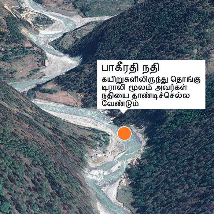 ஆர்ப்பரிக்கும் நீரின் மேல் உயரமாக அமைந்திருக்கும் கேபிளில் உலோக டிராலி அமைந்திருக்கிறது. அதனைக் கொண்டு சகோதரிகள் தங்களை நதியின் மறுபக்கத்திற்கு இழுத்துச் செல்ல வேண்டும்.