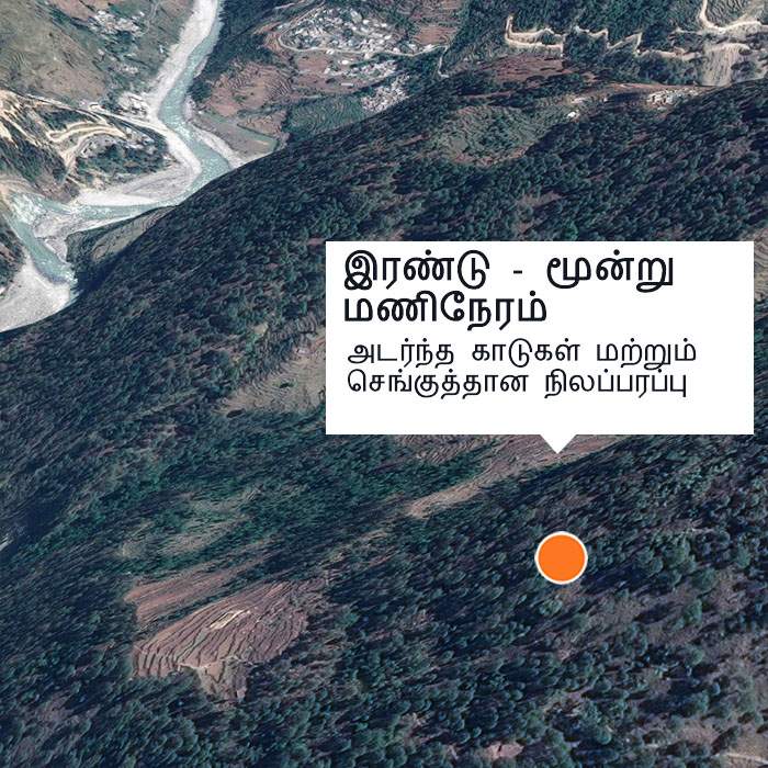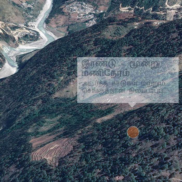 பாகீரதி நதியின் பாதுகாப்பு பகுதியான வடக்கு கரைப்பகுதியை சகோதரிகள் அடைந்தவுடன் பள்ளிக்கு சாலை வழியாக செல்வதற்காக காருக்காக காத்திருக்கிறார்கள்.