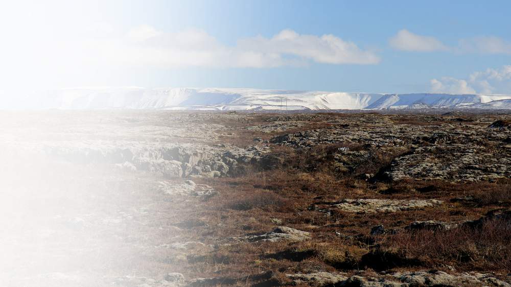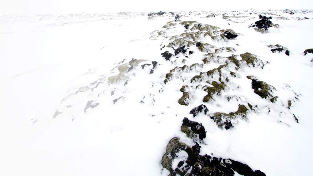 The lava rolls down from the jagged, snowcapped mountain ridge and across the Reykjanes peninsula, swamping the land like a petrified ocean - a swell of charcoal, grey and brown, flecked with a sickly mossy green.