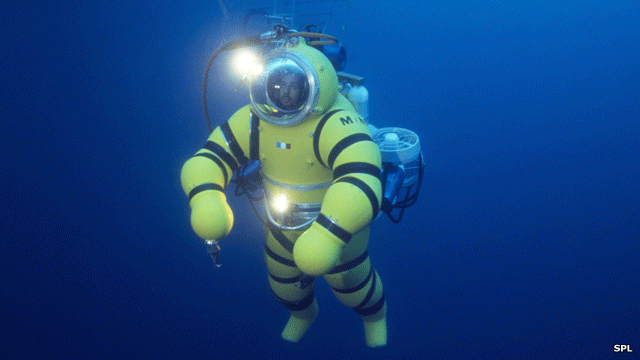 They may look as clunky as a suit of armour but some atmospheric diving suits (ADS) can enable people to reach depths of up to 600-700m. This ADS used by the French navy can reach 250m.