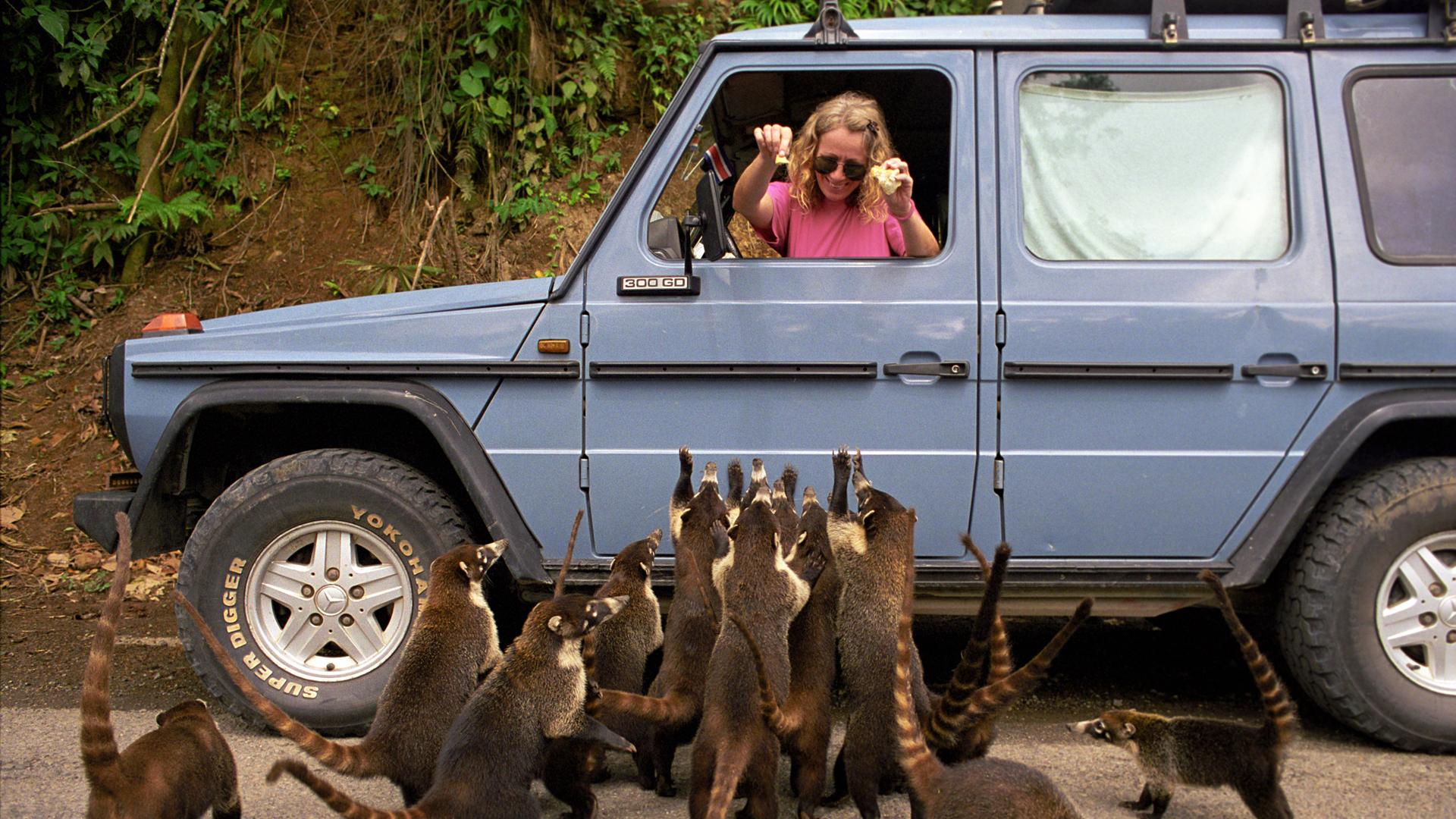 He brakes and steers the Mercedes G-Wagen towards the verge. It’s soft and gravelly, and the thick vegetation conceals a steep slope. Slowly the car slips, then starts a slow-motion roll. Mid-roll, it stops for a second, then it turns again - but hits a spindly tree, just strong enough to peg it in position on its side.