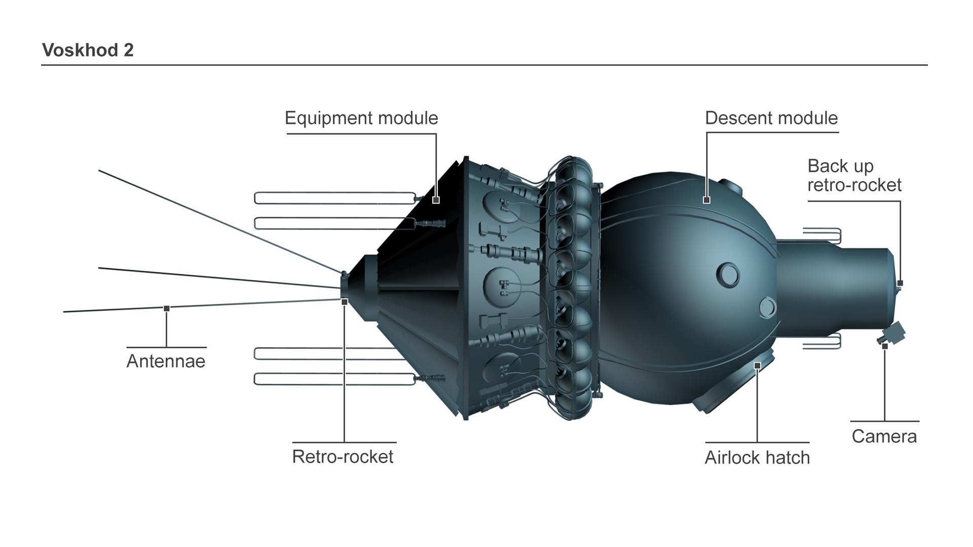 The spacecraft looked similar to the space vessels that Gagarin and other cosmonauts had flown in. But one of them was different. It was fitted with a transparent tube about 3m long and 1.2m wide – an airlock.