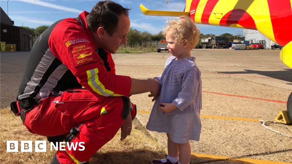 Essex and Herts Air AmbulanceA toddler who choked on a piece of chicken has been reunited with the medical staff who saved her life.