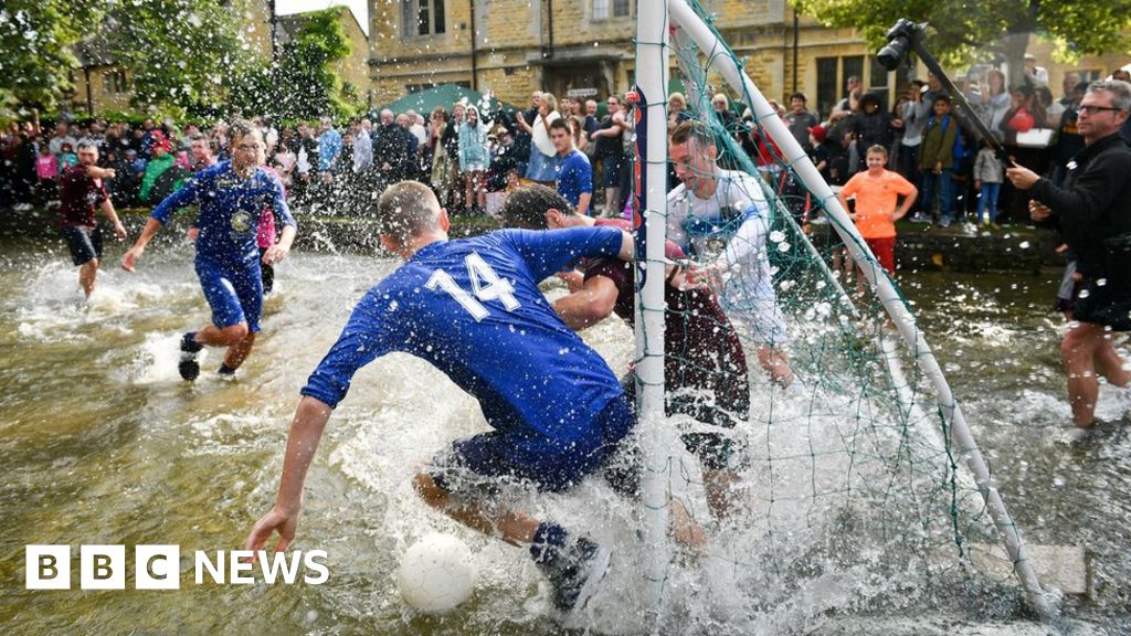 The annual event is played in the River Windrush, which is ankle-deep as it flows through the village of Bourton-on-the-Water in the Cotswolds.