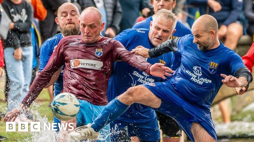 Teams braved chilly water to compete in the annual football in the river match in Bourton-on-the-Water.