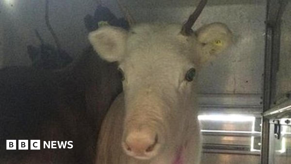 The albino reindeer, named Tinsel, went missing after "sneaking out" of the Leicestershire farm on Friday.