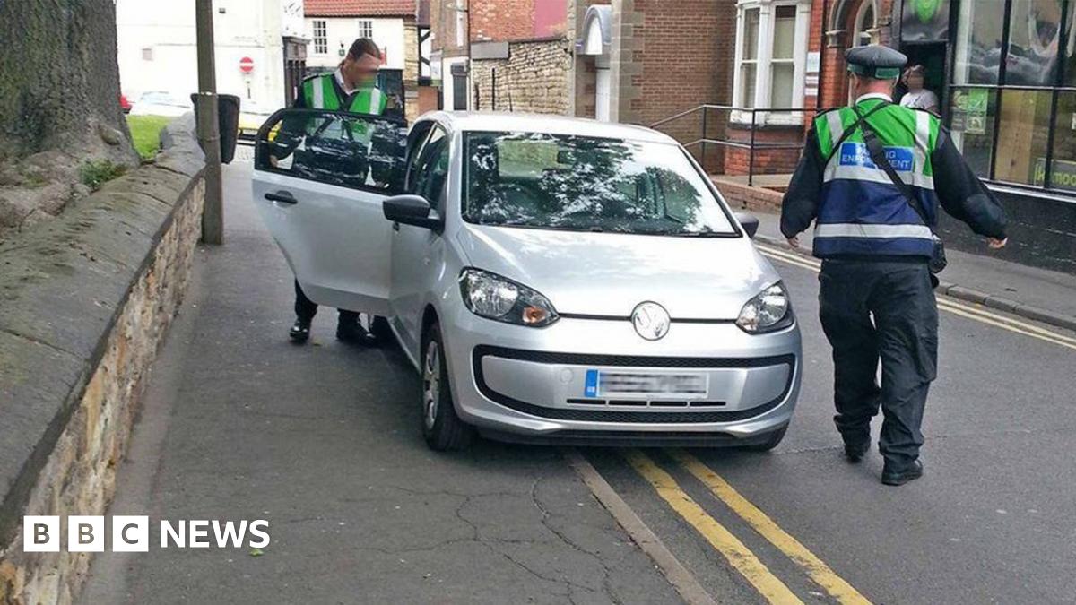 Two parking enforcement officers have been photographed parked on double yellow lines and a pavement as they ticketed a car and van in Lincoln.