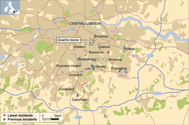 The attacks took place in Warlingham, Shirley, Beckenham, Bromley, Addiscombe, Orpington and West Dulwich.