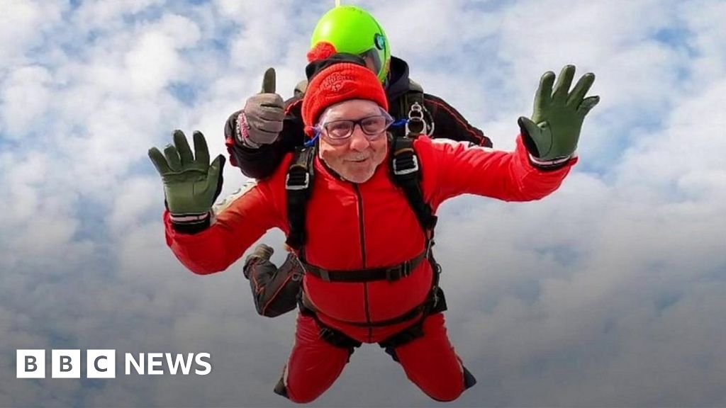 The septuagenarian, from Irlam, Salford, jumped 11,000ft (3,350m) from a plane to raise money for St Ann's Hospice which cared for his wife at its Little Hulton site.