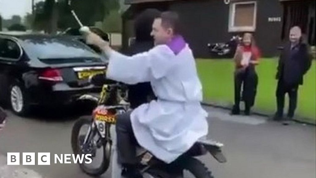 A priest who rode on an off-road motorcycle scattering holy water after a funeral has been criticised by his diocese.