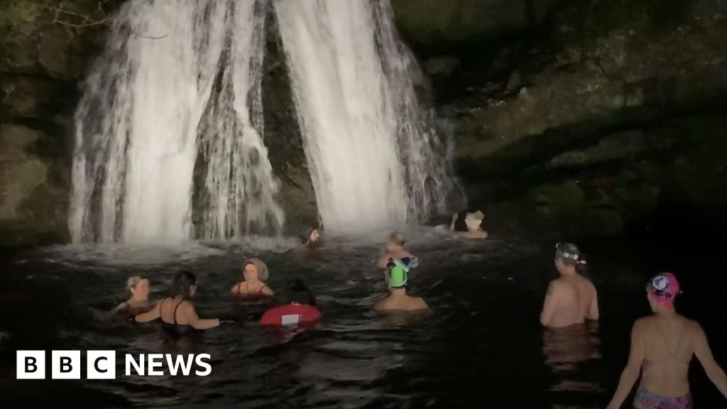 They joined the Dales Dippers group for a swim by torchlight at Janet's Foss waterfall and plunge pool near Malham in North Yorkshire.