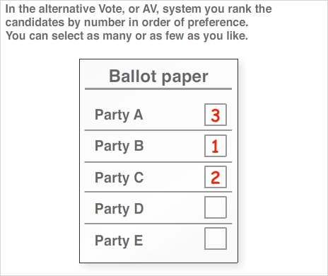 The AV system asks voters to rank candidates in order of preference. People can nominate as many preferences as they like. Only first preference votes are counted initially. Anyone getting more than 50% of these is elected automatically. If that doesn't happen, the candidate with the fewest votes is eliminated and their second choices allocated to the remaining candidates in a second round of counting. If one candidate then has more than 50% of the votes in this round they are elected. If not, the remaining candidate with the fewest votes is eliminated and their second preferences (or third preferences if they were the second choice of someone who voted for the first candidate to be eliminated) reallocated. This continues until one candidate has 50% or more of the vote in that round of counting, or there are no more votes to be distributed.
