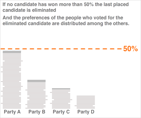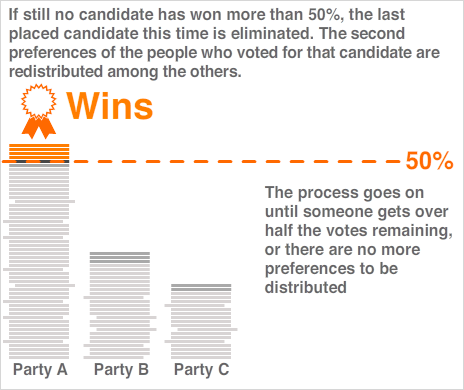 Instead of just voting for one candidate voters could rank candidates in order of preference, and these preferences could be used to decide the outcome in places where no candidate wins more than 50% of votes cast. Use this guide to find out more.