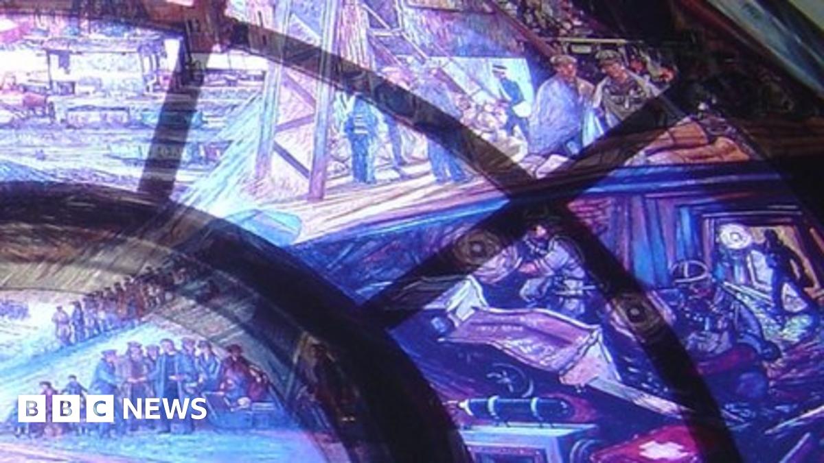 The stained glass replicates the Gresford Disaster Mural in Gresford church.