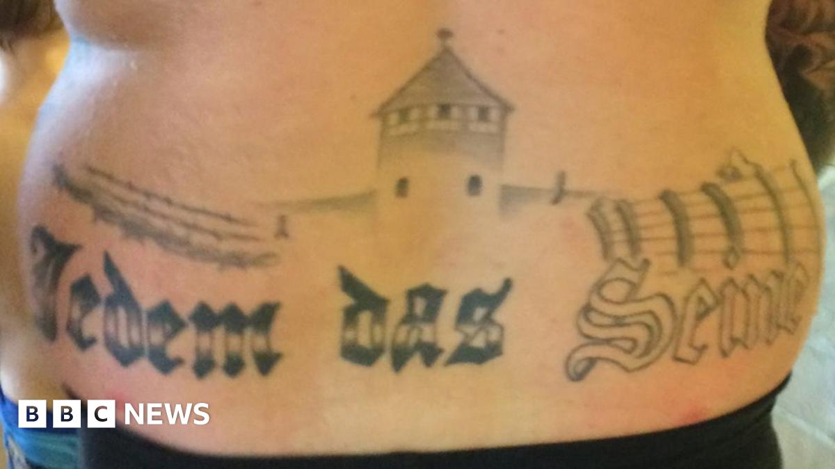 The tattoo has the slogan "To Each His Own", which was on the gate of the Buchenwald concentration camp.
