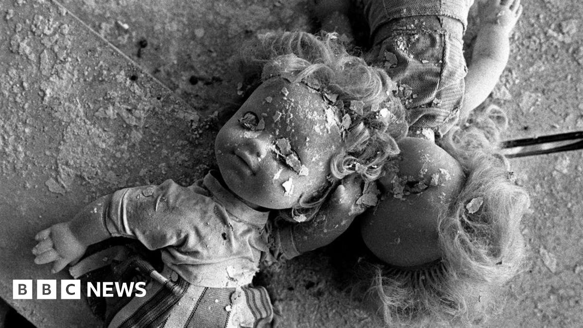 At the abandoned Little Bear kindergarten in Pripyat, desks and chairs are piled on top of one another and discarded toys lie in the dust.