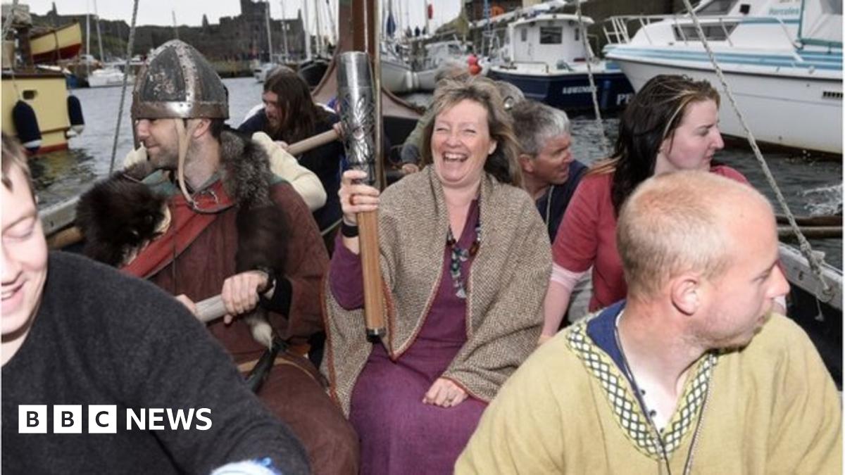 The baton was carried across Peel harbour on a Viking longboat on Sunday