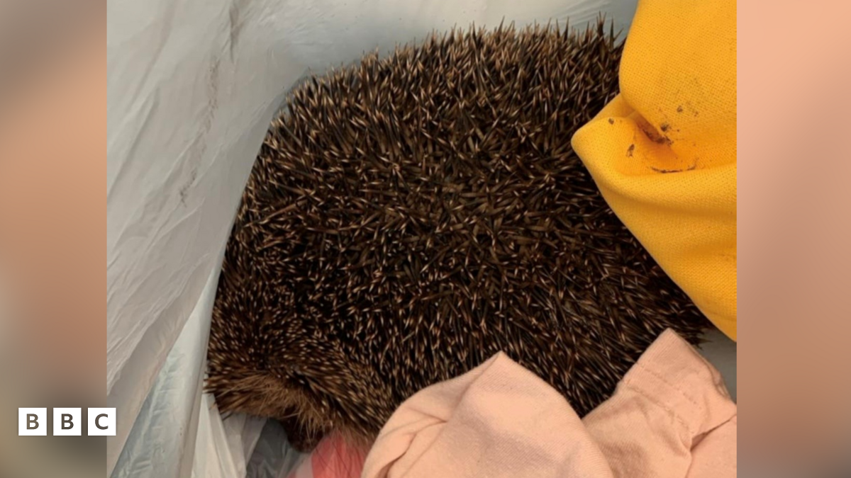A prickly hedgehog at the bottom of a white charity donation bag, with pink and yellow clothing items around it.Image source, Dawn's New Horizon