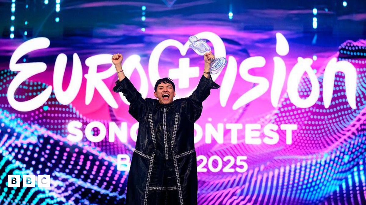 JJ representing Austria celebrates after winning the Grand Final of the 69th Eurovision Song Contest. The singer holds the trophy and cheers, in front of a purple, pink and blue Eurovision banner.Image source, Getty Images
