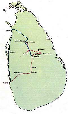 Coinciding with Sri Lanka's 50th anniversary of national independence, this exhibition was hailed by then-President Chandrika Kumaratunga as "a superlative collection, part of our national heritage". Quite the achievement for the younger son of a humble Church Lane, Belfast boot maker! How the Ulsterman Andrew Nicholl came to spend several years in (then) Ceylon of the later 1840s, is a piece of "serendipity" in keeping with the tropical island's ancient Arab name, Serendib. Nicholl first worked as a compositor at The Northern Whig, in the mid-1820s. A precocious artist since childhood, by the later 1820s, while still a printer's apprentice, without any formal art training he had produced over 100 watercolours of the Antrim Coast. By 1830 he was in London, transforming his technique by copying masterworks at the Dulwich College Gallery, then the only major collection open to the public.  | | (Above) Sir James Emerson Tennent, portrait circa 1845 | By 1837, he could style himself A.H.R.A. - Associate of Dublin's Royal Hibernian Academy. He moved back to London in 1840, where he remained until setting sail for Ceylon in 1846 as a result of a long-time association with one of The Northern Whig's earliest political contributors, Sir James Emerson Tennent (plain James Emerson until his 1832 marriage to a wealthy Belfast heiress named Letitia Tennent and his eventual knighthood after 13 often-turbulent years as Conservative MP for Belfast). In 1845 the Ulster-born Tennent, owner through marriage of Tempo Manor in Co. Fermanagh, for his parliamentary services had been awarded the coveted Chief Secretaryship of the Crown Colony of Ceylon, and soon after arriving on the Island arranged for his friend Nicholl back in London, to be made an art teacher at the government-run Colombo Academy (nowadays a prestigious Sri Lankan private school known as Royal College).  (Above) Map of route taken by Andrew Nicholl during his July 1848 Ceylon sketching tour | Nicholl left England for Ceylon in August 1846, crossing the Egyptian desert by camel to the Red Sea, as Orient-bound travellers did in those days before the Suez Canal. Not a great deal is known about his everyday life as an art teacher once he reached Colombo, except that the College ran into financial difficulties after a few years, forcing his permanent return to Britain's colder climes by 1849. Tennent followed him back from Ceylon to London not long after, caught up in the Westminster political aftershock from an 1848 failed Sinhalese rebellion during his tenure. Apart from his paintings and drawings, Andrew Nicholl did provide posterity with some account of his adventures in Ceylon, however - in the form of a vivid description published in the 1852 Dublin University Magazine, of a sketching tour that he made through part of the Island in July/August 1848, initially in the company of his patron Tennent, and later on his own, that ended up with his headlong flight from a rebel army! Blissfully ignorant of the perils that lay ahead, Nicholl and his companions set out by "hired palenkeen carriage" from Colombo for the central hill town of Kandy early in July, 1848. Once there, he enthused over the picturesque artificial lake built by a former king, surrounded by "undulating wooded hills", seen in the modern photograph below. The British had finally defeated the warlike, proudly independent Kandyans only thirty years before. The Temple of the Tooth, beside the lake, remains Sri Lanka's most sacred site for its majority Buddhist population. |