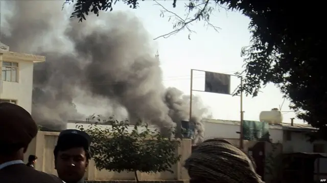 په تالقانو کې د والي په دفتر کې له ځانمرګي برید وروسته لوګی پورته کېږي، چې لږترلږه شپږ کسان په کې ووژل شول. د برید پړه وسله والو طالبانو پرغاړه اخیستې.