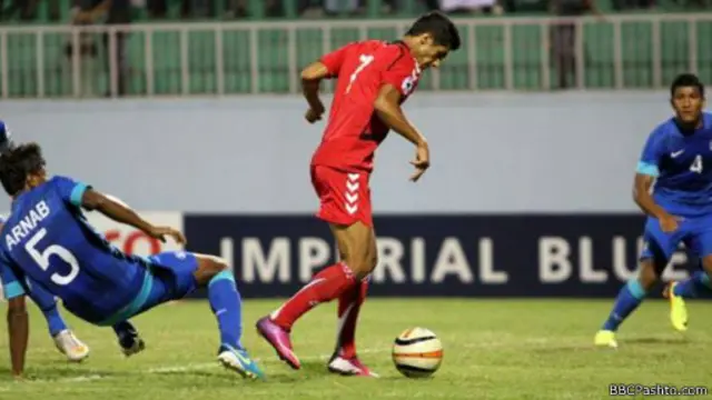 افغانستان د جنوبي اسيا فوټبال اتلوليو کې د هند پر وړاندې لوبېږي، د لوبې تر ۲۰ مې دقيقې افغان لوبډله يو د هند لوبډله صفر. افغان ګول ساتونکی خپل ګول په دفاع کې داسې ښکاري چې لږ خوږ شو...