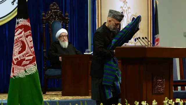 ولسمشر کرزی بیا سټیج ته راغی. ښاغلي مجددي پر غږ وکړ چې دغه سند امضا کړه، ژر یې امضا کړه.