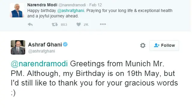 خو ولسمشر غني د جرمني مونیخ امنیتي غونډه کې و، له هماغه ځایه یې ښاغلي مودي ته په ځواب کې لیکلي چې: ''ښاغلی لومړی وزیره، له مونیخ نه مې سلامونه ومنه، که څه هم زما د زوکړې ورځ د مې ۱۹مه نېټه ده، خو په هر حال، له تا نه د زړه له کومي مننه کوم''.