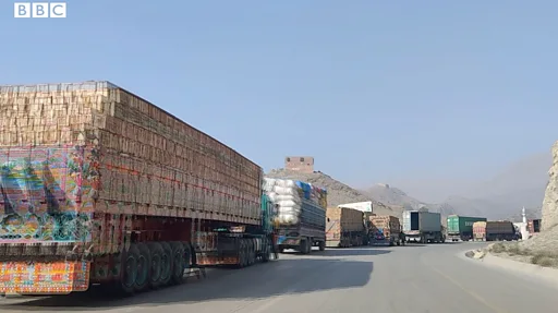 بي بي سي ته په رالېږلو ویډیوګانو او انځورونو کې ښکاري، چې د بېلابېلو توکو بار سلګونه لوی ګاډي له تورخمه تر لواړګي ولاړ دي.