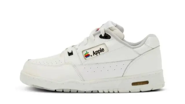 ددې سپین رنګه بوټانو پاسنۍ برخه چرمي ده او د اپل شرکت پخوانی سوداګریز نښان پرې لګول شوی چې د بوډۍ د ټال له رنګونو جوړه مڼه ده.