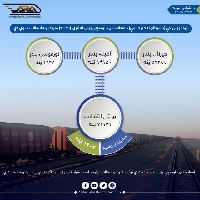 دغې ادارې ویلي، د سرطان/چنګاښ له ۹مې تر ۱۵ پورې، د حیرتان د اوسپنې پټلۍ له لارې ۵۲۳۸۹ ټنه، د اقینې اوسپنې پټلۍ له لارې ۱۴۱۵۰ ټنه او د تورغونډۍ اوسپنې پټلۍ له لارې ۴۶۳۷ ټنه انتقالات شوي، چې ټول ټال ۷۱۱۷۶ ټنه نفتي، غیر نفتي او نور مواد پکې شامل دي، هېواد ته وارد او صادر شوي دي.