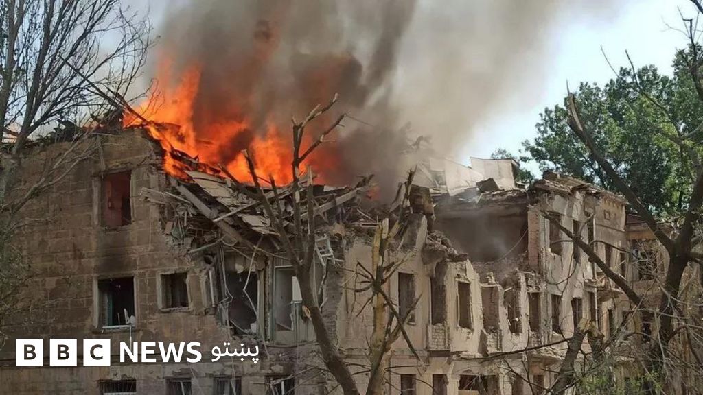 د اوکرايين ولسمشر په توغندیو د لګېدلي روغتون ویډیو خپره کړه چې اور پکې بل دی، لوخړې ترې پورته کېږي او اور وژونکې ډلې هم پکې ښکاري.