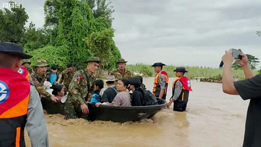 د میانمار دولتي رسنیو ویلي، د پوځي حکومت قومندان جنرال مین آنګ هیلینګ او نورو چارواکو د سېلاب ځپلې سیمې او د مرستو چارې له نژدې کتلې دي.
