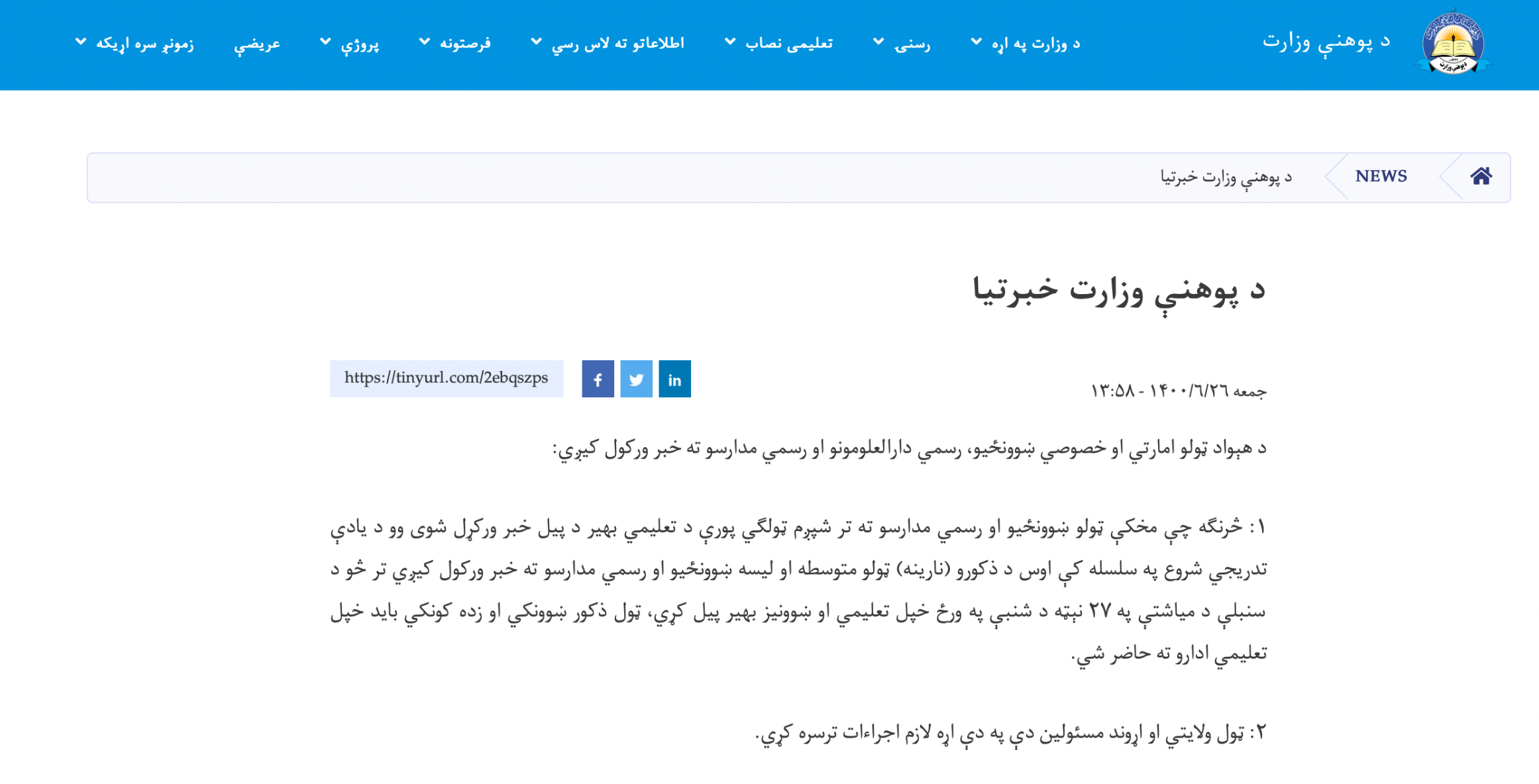 د طالبانو پر تازه واکمنۍ یوه ماشت اوښتې وه چې د سپتمبر پر اوولسمه یې د پوهنې وزارت په یوه خبر پاڼه کې یوازې له نارینه زدکوونکو او ښوونکو وغوښتل، ښوونځيو ته ستانه شي خو د نجونو منځنیو ښوونځيو د بیا پرانیستې په اړه یې څه ونه ویل.