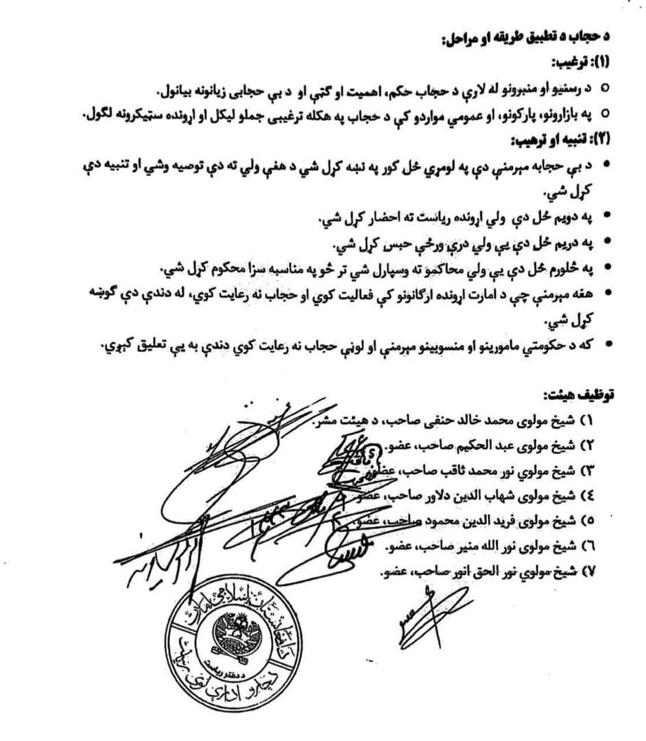 د حجاب په اړه طرحه کې د نورو ټکو تر څنګ دا هم ویل شوي وو چې که کومه ښځه حجاب مراعت نه کړي نو ولي یا د کورنۍ مشر ته به یې جزا ورکړل شي.