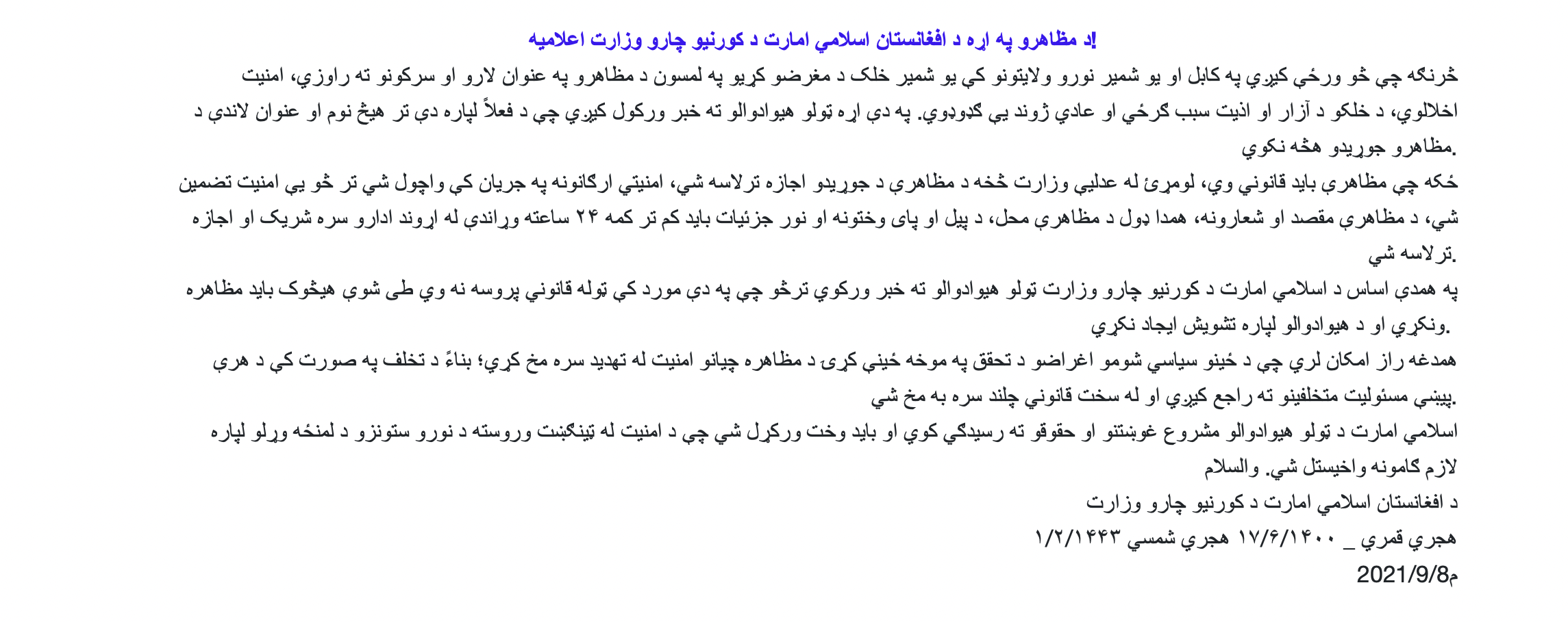 تر دغو پېښو څو ورځې وروسته د ۲۰۲۱ کال د سپتمبر پر اتمه د طالبانو حکومت د کورنیو چارو وزارت په یوه اعلامیه کې پر احتجاجونو محدودیت وضع کړ او ویې ویل چې هېڅوک باید د مظاهرو په نوم لارو کوڅو ته ونه وځي او مظاهرې باید "قانوني وي" او وار له مخه امنیتي ادارو ته خبر ورکړل شي.