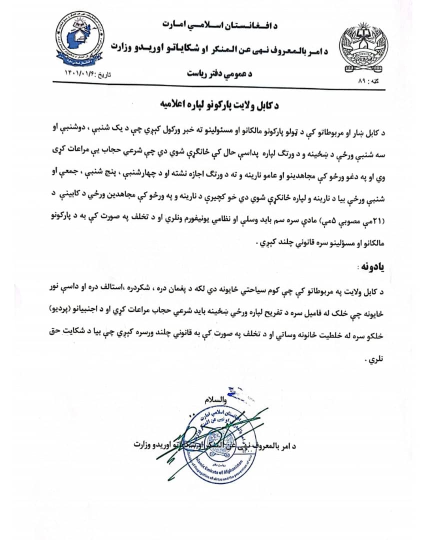تر دې شاوخوا درې میاشتې وروسته په کابل کې د ښځو لپاره ځانګړی شوی باغ (شراره بڼ) وتړل شو او د ۲۰۲۲ کال د نومبر پر لسمه پارکونو، حمامونو او ورزشي ځایونه ته د ښځو په ورتګ بندیز اعلان شو. امر بالمعروف وزارت په شفاهي ډول د دغو ځایونو څښتنانو ته سپارښتنه کړې وه چې ښځې دې نه ور پرېږدي او ویاند یې عاکف مهاجر هغه مهال ویل، "خویندو هغسې حجاب نه مراعتاوه چې په کار و، نو ځکه داسې پرېکړه وشوه".