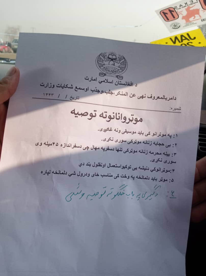 پر همدې میاشت په هرات کې د ښځينه موټر چلوونکو د روزنې ادارو ته د طالبانو ترافیکو مدیریت لفظي سپارښتنه کړې وه چې ښځې دې کورس ته نه ورپرېږدي، خو طالبانو ردوله. وروسته په هرات او کابل کې بي بي سي ته هم ځينو ښځينه موټر چلوونکو دا خبره تایید کړه چې د جواز اخیستلو مخه یې نیول شوې او د موټر چلونې کورس کې د کېناستلو اجازه نه ده ورکړل شوې. خو د طالبانو حکومت یوه چارواکي بي بي سي ته وویل، "که دوی له شرعي حجاب سره موټر وچلوي نو هېڅ ستونزه نه شته" خو یوه بل بیا ویل، "مرکزي حکومت ښځو ته د موټر چلونې د نویو جوازونو ورکول بند کړي دي".