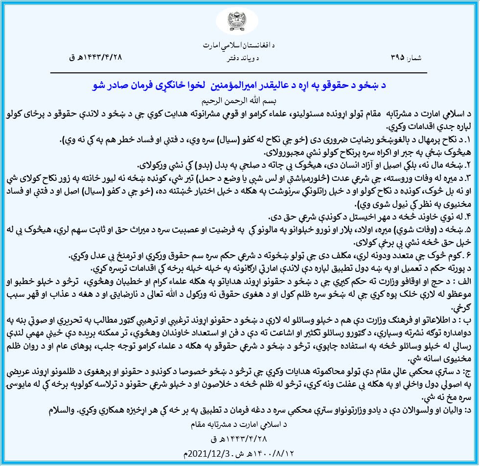 د ۲۰۲۱ کال د دسمبر پر درېیمه د طالبانو مشر ملا هیب الله اخوندزاده له لوري "د ښځو حقونو" په اړه فرمان خپور شو چې پکې ویل شوي، په واده کې د نجلۍ خوښه مهمه ده او په جبر باید چا ته په نکاح نه شي او نه هم باید په بدو کر ورکړل شي. د کونډو په اړه هم په فرمان کې ویل شوي وو چې د مېړه ورور دې یې په زور ځان ته نه نکاح کوي، بلکې خپلې خوښې ته باید پرېښودل شي. همدا راز یې د پلار او مېړه په میراث کې د ښځو حق خوندي بللی و.