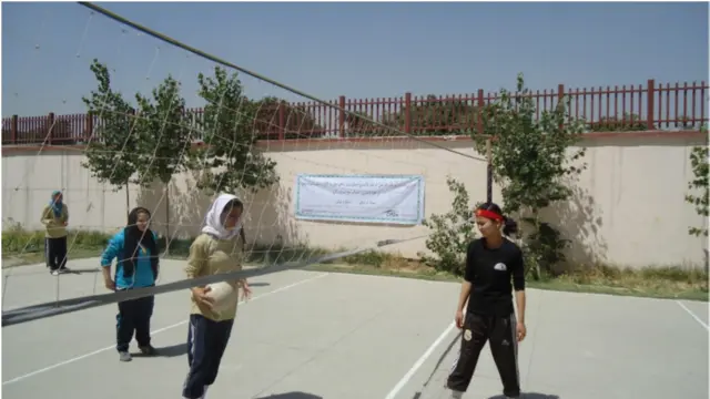 د عکس تشریح، په هغو لوبو كې چې نن د كابل ښار په سوريا لېسه كې د څلورو لوبډلو ترمنځ وشوې د سوريا او بي بي مهرو د نجونو لېسو واليبال لوبډلو وكولاى شول د رابيا او ام البنين لېسو په ماتولو سره د لوبو پايلوبې ته لار ومومي.