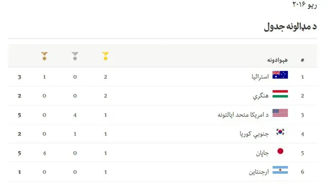 د مډالونو په جدول کې هنګري د سرو زرو د دوو مډالونو په ګټلو سره په دوهم نمبر، امريکا په درېيم، جنوبي کوريا په څلورم او جاپان پر پنځم نمبر دي. امريکا، جاپان او چين د پنځو پنځو مډالونو په ګټلو سره تر دې مهاله تر ټولو ډېر مډالونه ترلاسه کړي دي.