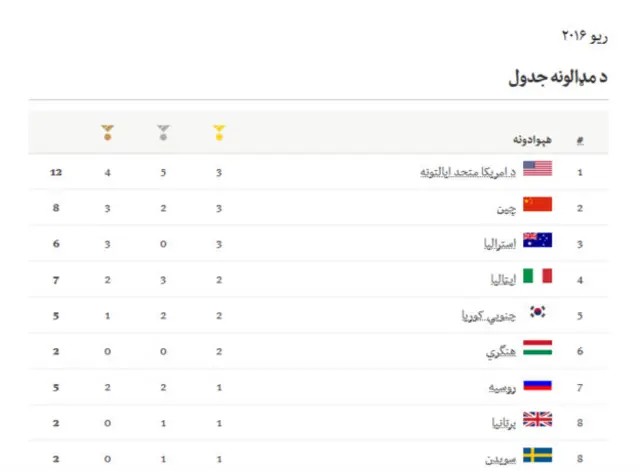 د برازيل په ريو کې د روانو اولمپيک سياليو په دوهمه ورځ امريکا د ټولو ۱۲ مډالونو په ګټلو سره د اولمپيک سياليو د جدول په سر کې ده.