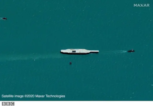 بي بي سي د سپوږمکۍ داسې انځورونه ترلاسه کړي چې ښيي، ایران وروستیو ورځو کې د امریکا د الوتکې وړونکۍ بېړۍ پخوانۍ نمونه یا سمپل له رغولو وروسته د جولای پر ۲۶ هرمز تنګي ته وړی دی.