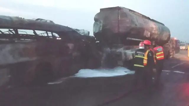 مرستندویانو ویلي د دغو موترونو له ټکر سره د تېلو ټانکر اور اخیستی.